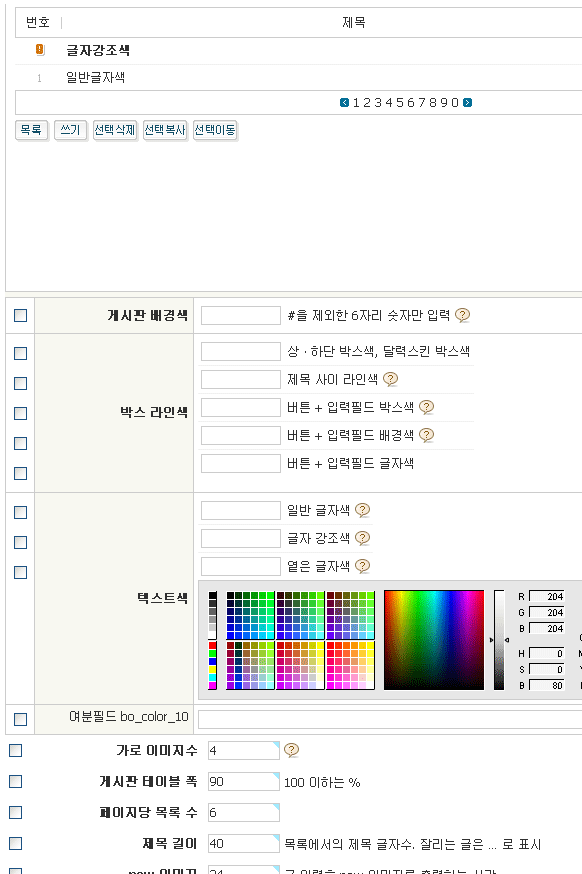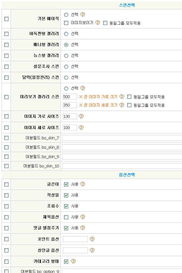 그리고 bo_1 ~ bo_sbj_10 까지의 여분필드 대신 bo_skin_1 ~10, bo_option_1 ~10, bo_color_1 ~ 10 까지 30개의 필드를 새롭게 추가하여 bo_1 ~10 의 여분필드를 사용하는 타 게시판에 영향을 주지 않게 하였습니다.
