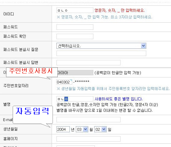 주민번호 사용시는 앞자리만 입력하게 되어있습니다.(주민번호입력시성별생성)