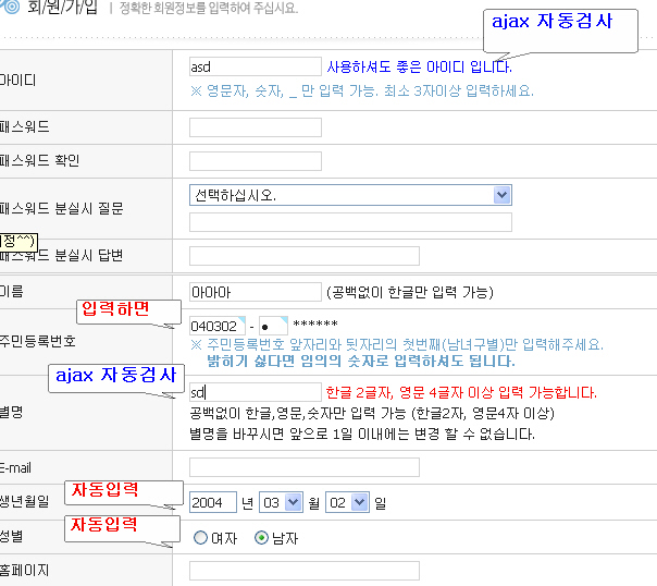 회원가입 PhotoFly님의 Ajax 회원가입 폼(UTF-8) + 싱글하트님의 자동 생년월일과 성별입력
