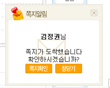 쪽지 실시간 쪽지에 레이어 알림창 기능 쪽지입니다.