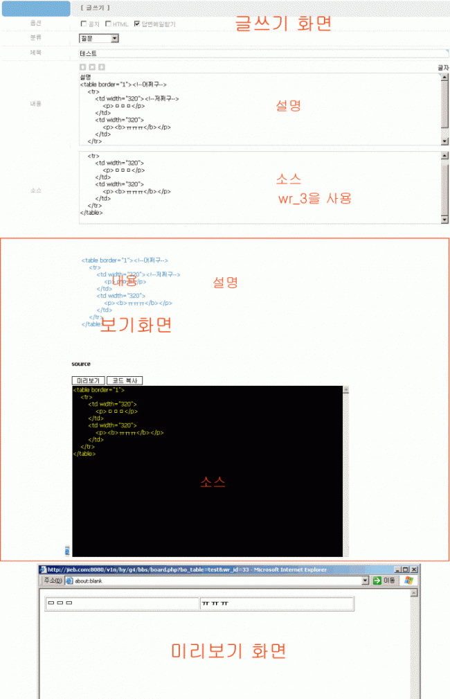 wr_3에 첨부 소스를 입력하면 미리보기 기능과 소스복사 기능이 가능 합니다.