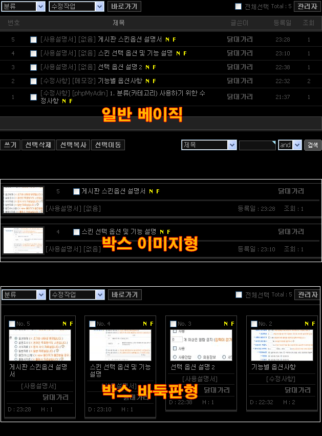 : 기본 리스트스킨을 제외하고 박스스킨, 한줄 메모장 스킨이 추가되었고 갤러리 스킨도 한가지 더 추가하였습니다.