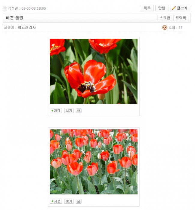 베이직게시판에 이미지만첨부할경우 스샷처럼 보이게 되며 각각의 이미지저장,전체크기,프린트 버튼이 보입니다. 그리고 이미지를 첨부했을경우 오른쪽마우스금지,드래그금지가 작동합니다