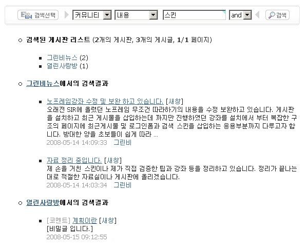 기본환경설정에서 검색스킨도, 최신글보기스킨도, 접속자 스킨도 모두 그린비로 바뀌었어요 뜨락님 감사합니다~