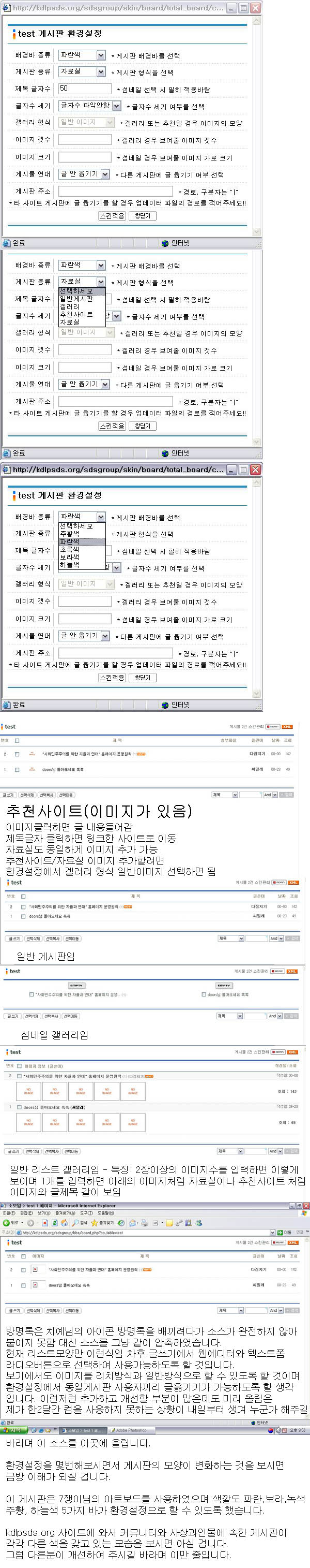 현재 kdlpsds.org 에서 일반게시판과 사진실을 모양과 바색깔 설정해서 사용중이며 차후 이 게시판하나로 통합할려고 만들었습니다. 게시판 스킨도 너무 많으니 관리가 어려워져서 ㅠ.ㅠ
