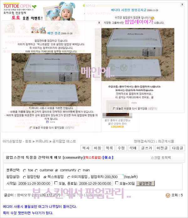 - 팝업레이어의 투명도 90%로 설정, 드래그, jquery easydrag(투명도는 최신글스킨에서 직접수정해야함)