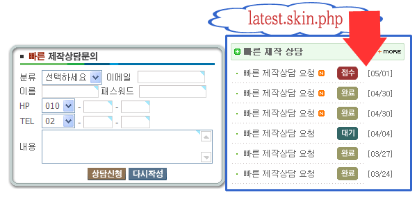 <?=latest("스킨이름", "게시판이름", 출력할 라인수, 출력할 글자수);?> 을 적어 주시면 됩니다.