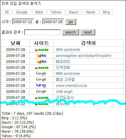 • 구글, 네이트, 야후, 다음, 네이버, 빙에서 검색해서 들어온 검색어를 보여줍니다.