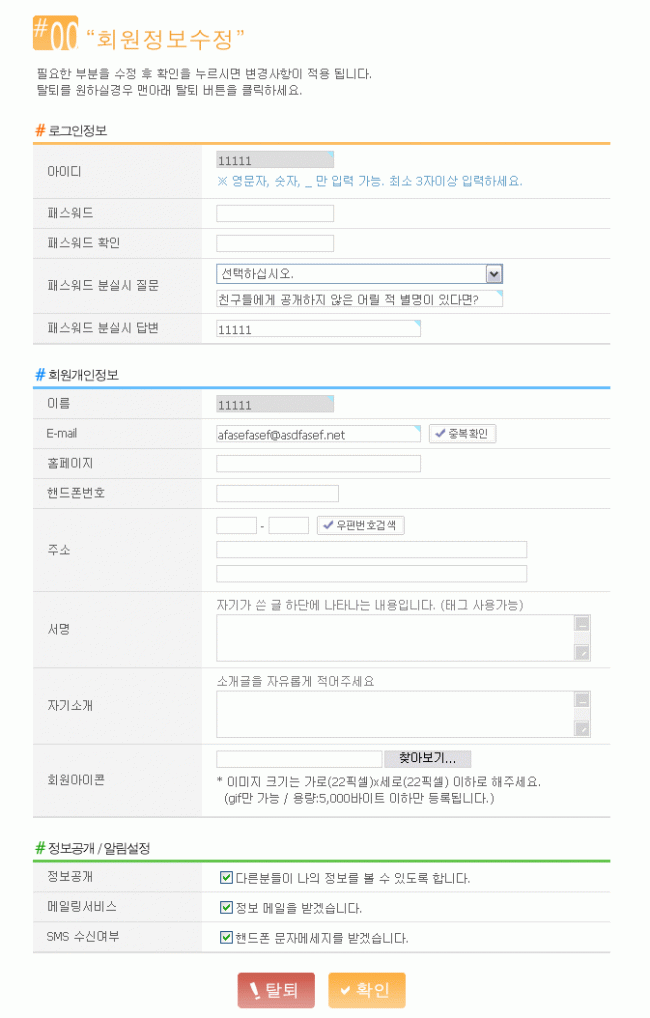 *정보 수정시 회원탈퇴가 가능합니다 (기본 지포는.. 탈퇴에 대한 부분이 소스 수정 이전까진 오리무중이죠?ㅋㅋ)