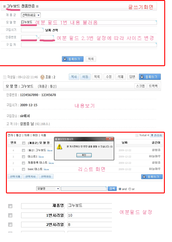 비밀글 사용, 여유필드 1번 제품명 입력 여유필드 2,3 시리얼 자릿수