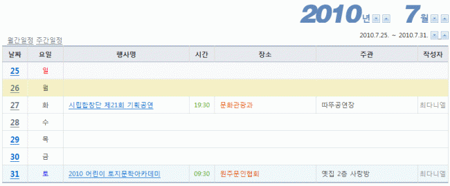 월간보기에서 입력한 행사내용이 주간보기에서는 보이지 않고, 주간보기에서 입력한 행사내용은 월간보기에서 다 보임.