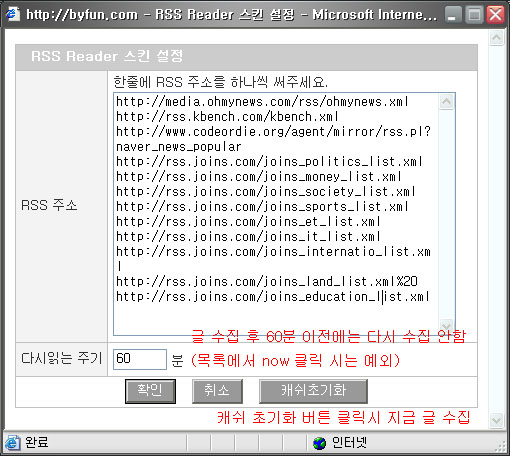 제경우 해당 스킨을 설치하고 setup 설정에서 http://media.ohmynews.com/rss/ohmynews.xml 넣고