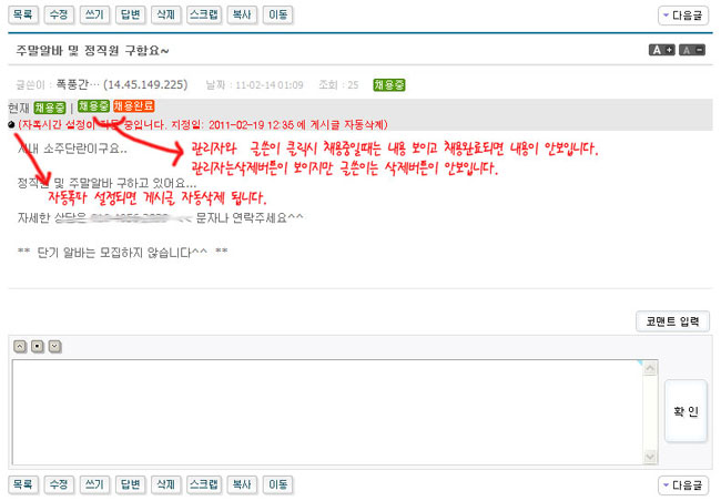 (관리자와 글쓴이 클릭시 채용중일때는 내용 보이고 채용완료되면 내용이 안보입니다.
