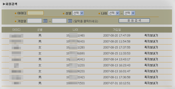 <td class=Cwhite>아이디<td class=Cwhite>성별<td class=Cwhite>나이<td class=Cwhite>가입일<td class=Cwhite>