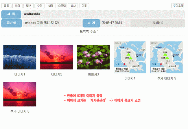 2. '게시판관리' -> '파일설명'에 체크 (이러면, 이미지의 바로 아래 설명글이 나타남) 위 코드와는 별도로 게시판에서 개당이미지의 폭을 조정할수 있는 기본설정환경이 있어서