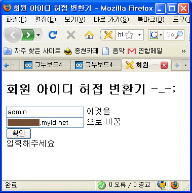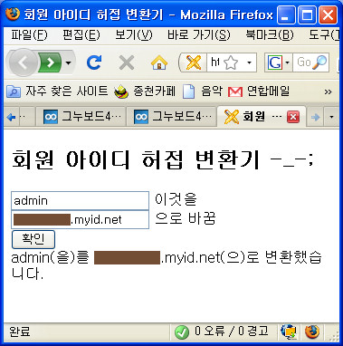 이 프로그램은 수동으로 바꿔주지만 수정하시면 사용자가 직접 아이디를 바꿀 수도 있게 할 수 있습니다. 자동식이죠. 하지만 저와 같이 로그인 시스템을 오픈아이디로 바꾸거나 사이트 통합 과정에서 아이디 통합 교체가 필요한 특수한 경우를 제외하고는 회원이 직접 본인의 아이디를 수정하는 것은 뭐 그렇게 추천할 만한 건 아니지요.