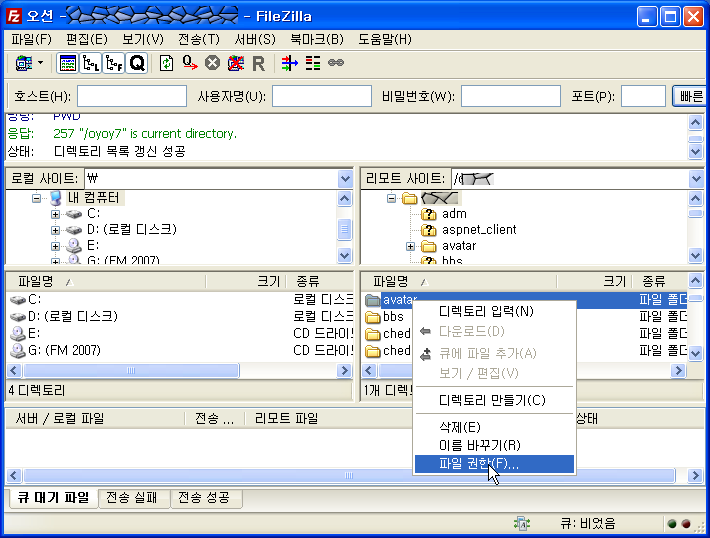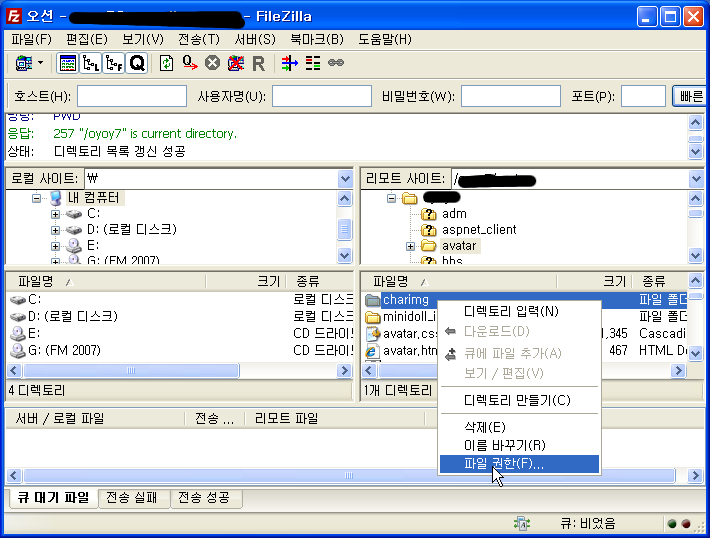먼저 파일질라를 이용하시는 분들은 avatsr 폴더의 오른쪽 버튼을 누르시고 파일 권한을 선택하시면 됩니다.