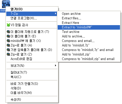 먼저 minidoll.7z의 파일을 7-zip로 압축을 해제합니다. 다른 압축 프로그램을 사용하면 압축이 정상적으로 해제가 되질 않습니다.