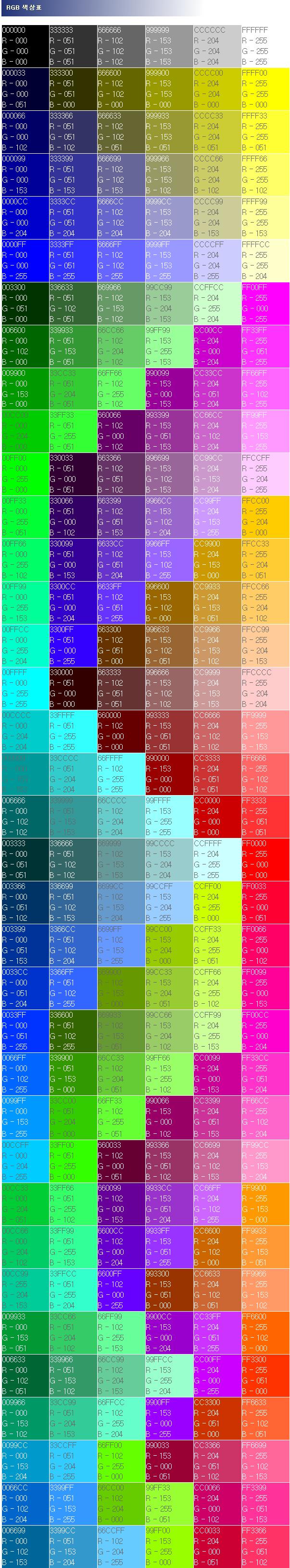 RGB 색상표의 코드는 포토샵 등에서 칼라찍어보시면 R,G,B 코드 잘 나옵니다. ^^