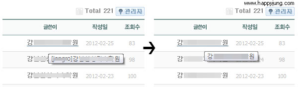 목록 이름 마우스 오버할때 아이디 안보이기 정보
