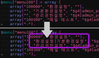 - 변경할 admin.menuXXX.php 파일을 열어서 첫 하위메뉴명 앞에 상단메뉴명| (버티컬바?)를 넣습니다.