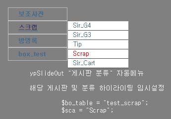 ypSlideOut 슬라이드 스크립트를 이용한 간단한"게시판세로 분류세로" 슬라이드형 자동 메뉴입니다.