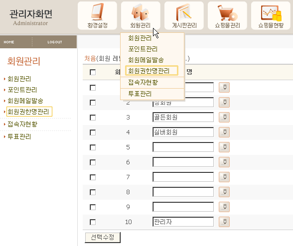 회원관리에서 권한 콤보박스에 권한 1, 2, 3.....만나타나고 권한명(손님, 준회원등...이