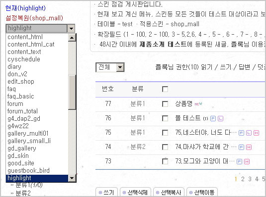 스킨폴더에 있는 모든 스킨을 셀렉트박스 형태로 불러와 게시판에 바로 적용해 볼수 있는 팁입니다.