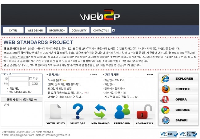 지겹도록 리뉴얼 하고있네요~ 새롭게 만들어 낸다기보다, 함께 하고자 하는 사람들이 필요해서입니다. ^^; 웹 표준에 있어서 관심이 많으신분들과 또한 공부 중이신분들 이런 분들과 함께 하고싶지만, 아직 그러한 사람들이 많지 않은듯 생각이 드네요.