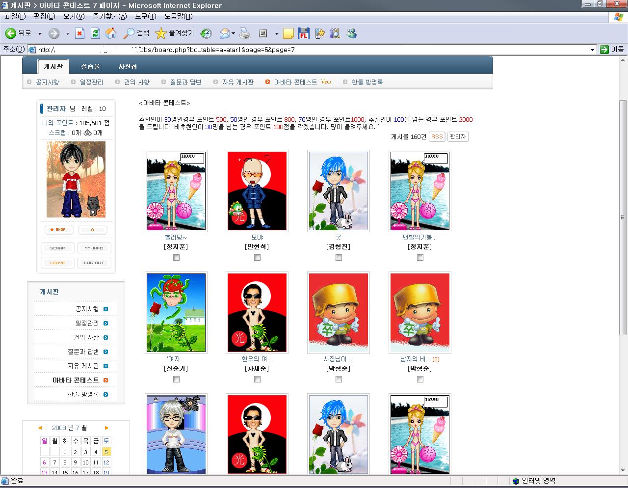 그누보드4에 아바타를 연동시켜 쓰다가 아바타 콘테스트기능을 할수있게 스킨을 변경하였습니다. 3일동안 소스를 수정하여 겨우 오늘에서야 만들었네요. 아직 기능이 충분치 않아 버그잡고 완성하면 공개도 할까 생각중입니다.