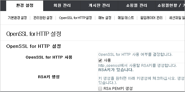 관리자 모드 → 환경설정 → OpenSSL for HTTP설정