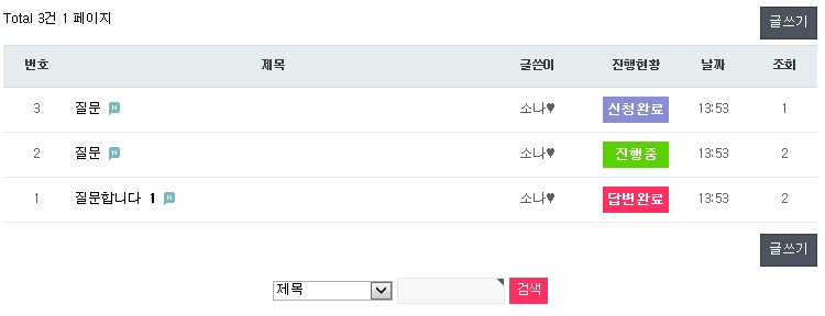 일반 회원이 글을 쓰면 신청완료로 됩니다
