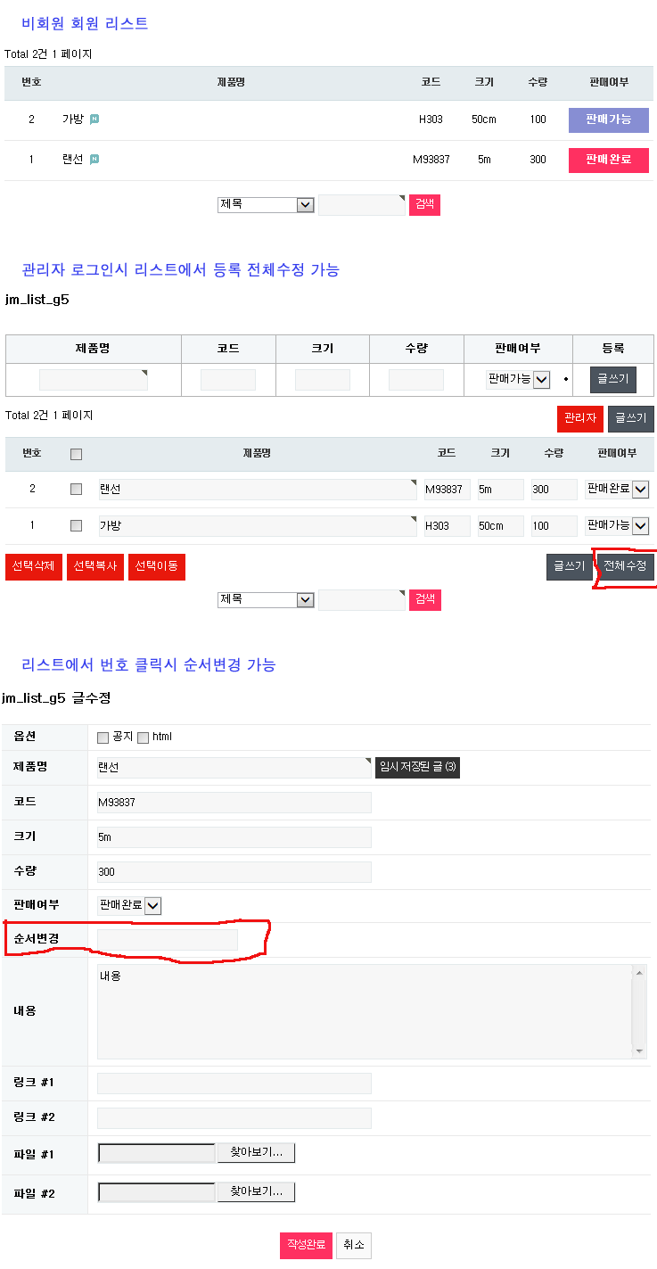 리스트에서 등록 전체수정 순서변경 가능 게시판 정보