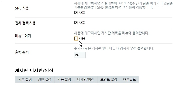 게시판 관리로 들어가서 메뉴가 보이지않게 설정합니다.