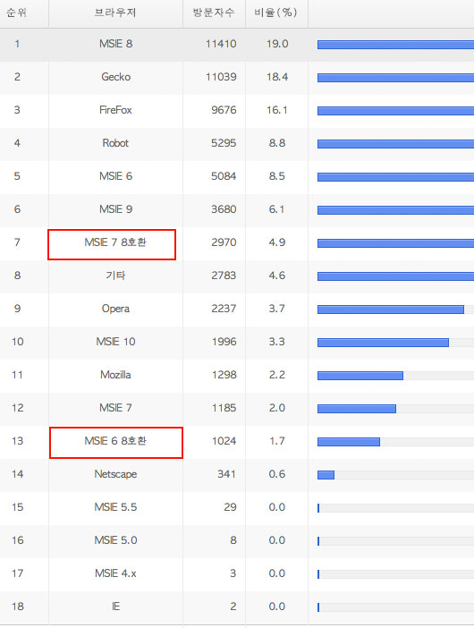 추가.. ie 6 (7도...)을 MS가 버렸음에도 아직 10% 가까이 나타납니다.