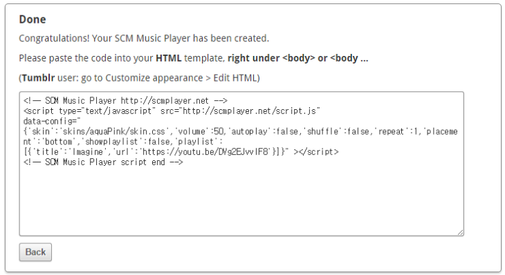 data-config="{'skin':'skins/aquaPink/skin.css','volume':50,'autoplay':false,'shuffle':false,'repeat':1,'placement':'bottom','showplaylist':false,'playlist':[{'title':'Imagine','url':'https://youtu.be/DVg2EJvvlF8'}]}" ></script>