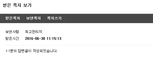 1:1 문의 게시판에 글을 등록 후 관리자가 해당 글에 답변 글을 달면 원 글 작성자에게 쪽지를 발송합니다.