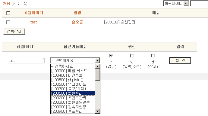 입력방법은 아래 하단에 회원아이디를 입력하고 접근가능메뉴와 권한을 선택한 후 확인을 클릭하면 상단 리스트에 표시됩니다. 관리권한은 특정한 회원에게 특정 관리자페이지에 접근할 수 있는 권한을 줄 경우에 사용합니다.