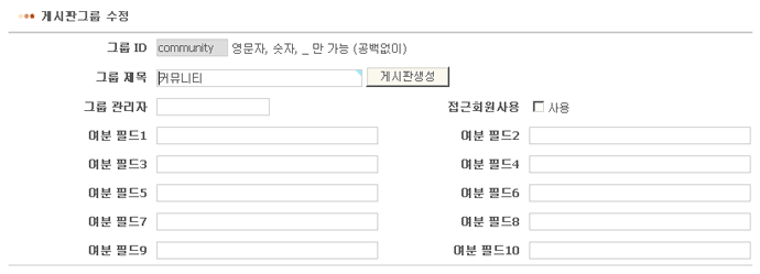 게시판그룹의 여분 필드는 미리 10개가 준비되어 있습니다. 여분 필드는 테이블에 필드를 추가할 일이 생겼을 때 사용하는 것입니다. 여분 필드는 <?=$group[gr_1]?> 과 같은 방법으로 출력할 수 있습니다.