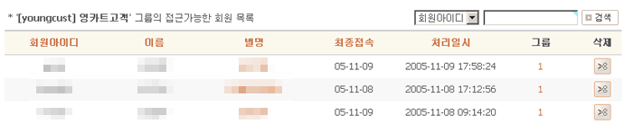 게시판그룹 리스트에서 접근회원수를 클릭하면 보시는 해당 게시판그룹에 접근이 가능한 회원의 목록이 출력됩니다.