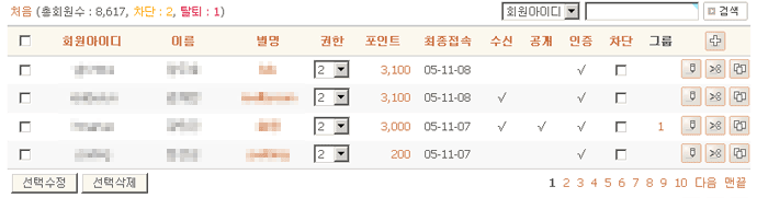 선택수정은 회원리스트에서는 권한과 차단 두 개의 필드를 수정하실 수 있습니다. 리스트의 앞에 있는 체크박스에 체크하신 후 권한 및 차단을 선택한 후 선택수정을 클릭하시면 체크박스에 선택하신 회원의 정보만 수정합니다. 일괄적으로 권한등을 수정하실 때 사용하시면 좋습니다.