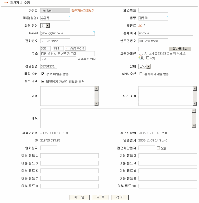회원정보 수정은 회원 가입한 내용을 보여주고 수정하는 역할을 합니다. 패스워드는 입력하지 않으면 기존에 사용하던 패스워드를 유지합니다. 여분 필드는 프로그램을 수정하여 사용하시는 경우 기존 테이블에 필드를 추가하는 불편없이 여분으로 사용하실 수 있도록 마련된 필드입니다. mb_1에서 mb_10 까지 사용하실 수 있으며 프로그램에서 출력하시는 경우에는 회원로그인 된 경우에 한하여 <?=$member[mb_1]?> 와 같은 방법으로 사용할 수 있습니다. 회원의 접근을 차단하는 경우에는 차단일자에 오늘 체크하시면 오늘 날짜가 자동으로 입력됩니다.