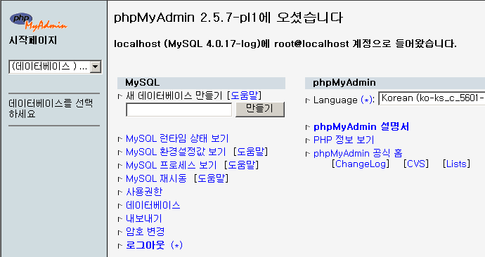 phpMyAdmin 으로 접속하시면 다음과 같은 화면이 표시됩니다.