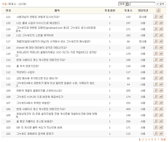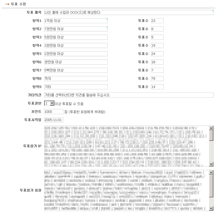 기타의견에 내용을 입력하는 경우에는 투표에서 기타의견을 입력 받을 수 있습니다. 투표권한을 주어 일정권한 이상의 회원만 투표에 참여하게 할 수도 있습니다.