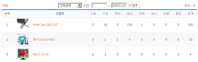 처음 출력시에는 합계를 기준으로 순위를 표시하므로 제대로 맞지 않는다고 생각되시면 상단 제목 (쇼핑 ~ 품절)을 클릭하여 순위를 조회하십시오.