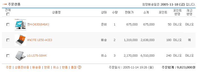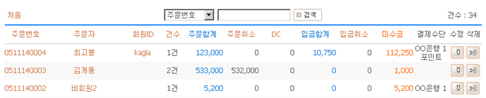 • 주문번호는 주문일 6자리(2005년 11월 14일 일 경우 051114로 표시) + 순번(0001부터 9999까지) 으로 표시됩니다. • 주문자 링크를 클릭하면 해당 주문자가 주문한 내용만 표시됩니다. • 회원ID 링크를 클릭하면 해당 회원이 주문한 내용만 표시됩니다. • 건수 : 하나의 주문에 여러 가지 상품을 담아 주문할 수 있습니다. 건수는 여러 가지 상품의 건수를 말하며 상품의 수량이