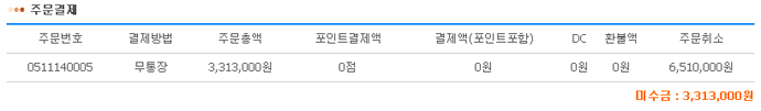 • DC는 해당 주문에 대해 할인해준 금액이 표시됩니다. • 입금합계는 (무통장입금 또는 신용카드 또는 계좌이체) + 포인트결제액의 합산된 금액입니다. • 입금취소는 환불 또는 신용카드 승인취소 금액의 합산된 금액입니다. • 미수금(미입금) = 주문합계 - 주문취소 - DC - (입금합계 + 입금취소) • 포인트는 다른 결제수단과 같이 결제하는 것이 가능합니다. • 결제수단에는 신용카드로 결제한 경우 "카드", 실시간 계좌이체로 결제한 경우 경우 "실시간", 무통장으로 입금한 경우 "은행이름", 포인트 결제의 경우 "포인트"로 표시됩니다.