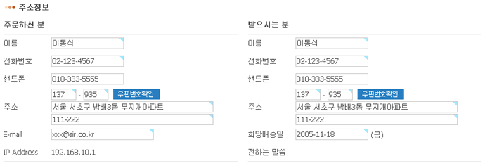 • 주소정보는 주문하신 분과 받으시는 분의 정보를 표시하며 입력 박스의 값은 수정이 가능합니다.