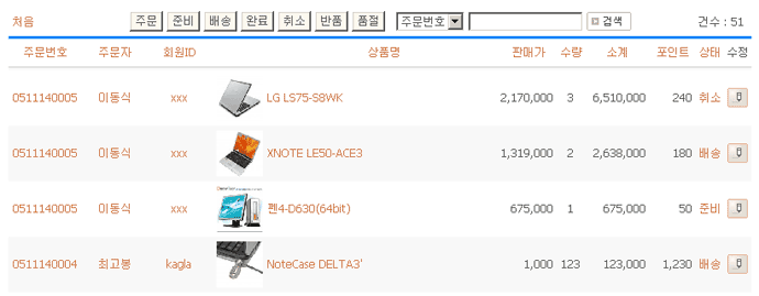 • 상단의 주문, 준비, 배송, 완료, 취소, 반품, 품절 버튼을 클릭하면 해당 상태만 표시하므로 주문대기 중인 상품 또는 배송이 완료된 상품들로만 조회가 가능합니다. • 주문번호를 클릭하시면 같은 주문번호의 주문만 조회합니다. • 주문자를 클릭하시면 같은 주문자의 주문만 조회합니다. • 회원ID를 클릭하시면 같은 회원ID의 주문만 조회합니다. • 수정을 클릭하시면 해당 주문에 대한 주문관리의 상세페이지로 이동합니다.