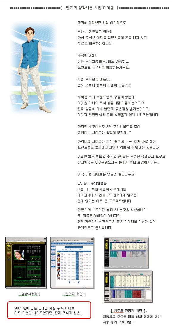 아주 좋은 아이디어입니다. 이 아이템의 핵심 기술은 증권거래소의 매일 공시되는 종가를 긁어와서 회원들의 사고판 주식에 적용시켜야 되는데요. 솔직히 그 정도 기술력이면 공공기관이나 대기업 입찰할 정도겠네요. 차라리 주식보단 선물거래를 가상으로 해보는 시스템이 어떨까요?